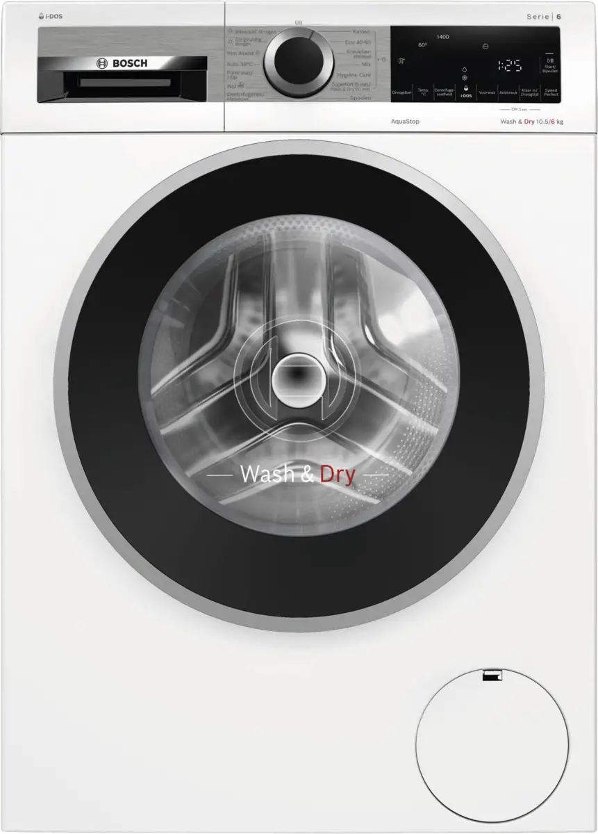Was-droogcombinatie, 10,5 kg laadvermogen wassen, 6 kg laadvermogen drogen, Vario-trommel, Eindtijd keuze, Bijvulfunctie, LED-Display, Programmaverloop weergave, i-Dos, ActiveWater Plus, Programma’s en opties Hygiëne, Koud, Wol / handwas, Tijdprogramma, Beladingsherkenning, Onbalansherkenning, Zelfreinigende Condensor, EcoSilence Drive motor, Aquastop, Kinderbeveiliging, Energieklasse D, netto breedte: 59,8 cm, netto hoogte: 84,8 cm, netto diepte: 59 cm